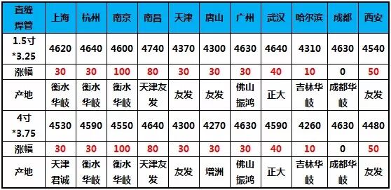 6日天津(jīn)利達鋼管(guǎn)所有產品統一上(shàng)調20元/噸,4寸*3.5mm掛牌(pái)價(jià):焊管(guǎn)4590元/噸,鍍鋅管5390元/噸,鋼塑管7460元(yuán)/噸,過磅含稅;