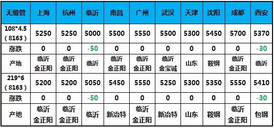 6日臨沂無縫管價格降50元/噸。57*3.5mm臨沂(冷管)5550元/噸,108*4.5mm臨沂5000元/噸。